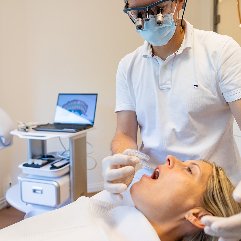 Mit der Aligner-Therapie bieten wir Ihnen eine dezente und effektive Möglichkeit, Zahnfehlstellungen zu korrigieren. Die nahezu unsichtbaren Zahnschienen sind angenehm zu tragen und fügen sich unauffällig in Ihren Alltag ein. Schritt für Schritt verhelfen sie Ihnen zu geraden Zähnen – ganz ohne auffällige Zahnspange.